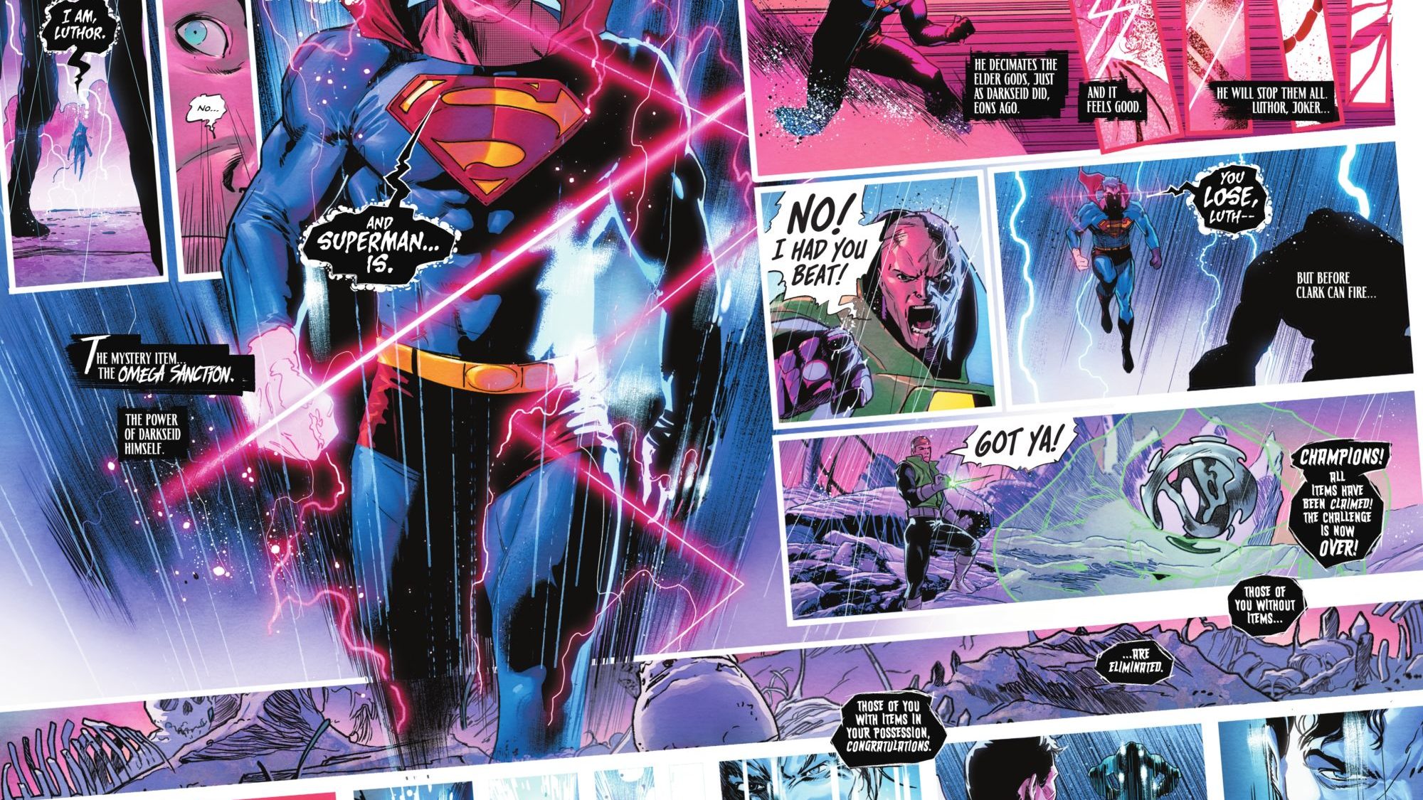 In the current World’s Finest arc, Superman, Batman, and their super-friends have been forced to confront a Doomsday-level threat named Doom-Mite. Silly appearance aside, Doom-Mite is nothing to be trifled with, and he makes that clear when he makes easy work of the heroes. Most notably, he beats Superman to a bloody pulp and transforms Batman into a nightmarish puppet. While Superman and Robin stall, Mr. Mxyzptlk and Bat-Mite are tasked by the Man of Steel to collect every magic-user they can to help them pull the Sixth Dimension from underneath Doom-Mite.